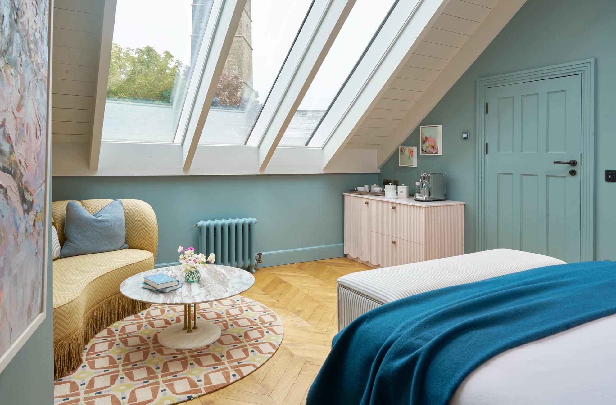 This bright room is built into the rafters of the building and features an astonishingly expansive skylight, which reveals views of the village’s Medieval church tower. On clear evenings, pour a glass of something good from the mini bar of premium drinks and snuggle down in the sitting area to watch the stars illuminate the night sky.
